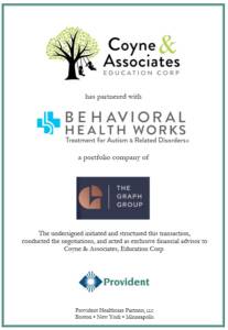 “Coyne & Associates has long been dedicated to providing exceptional ABA services and creating meaningful outcomes for the children and families we serve. As we looked toward the next chapter, it was essential for us to identify a partner who shared our values and commitment to high-quality care. We are pleased to have found that alignment with Behavioral Health Works, who we believe is well-positioned to support our continued growth and expand access to much-needed services. Provident played an instrumental role in helping us evaluate opportunities and navigate this important transition. Their expertise and partnership were invaluable, and we are deeply appreciative of their support every step of the way,” added April Worsdell, Chief Executive Officer of Coyne.