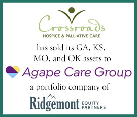 Provident Healthcare Partners (“Provident”), a leading healthcare investment banking firm, announced it has advised Crossroads Hospice & Palliative Care (“Crossroads”) on its partnership with Agape Care Group (“Agape”), a portfolio company of Ridgemont Equity Partners. Agape has acquired select Crossroads locations in Oklahoma, Missouri, Kansas, and Georgia. Crossroads will continue to independently operate in Tennessee, Ohio, and Pennsylvania.