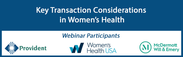 - The discussion focuses on providing physicians with an industry update regarding the current trends and transaction activity driving today’s women’s health market, how to evaluate a potential long-term partner, and the potential risks associated with pursuing a transaction.